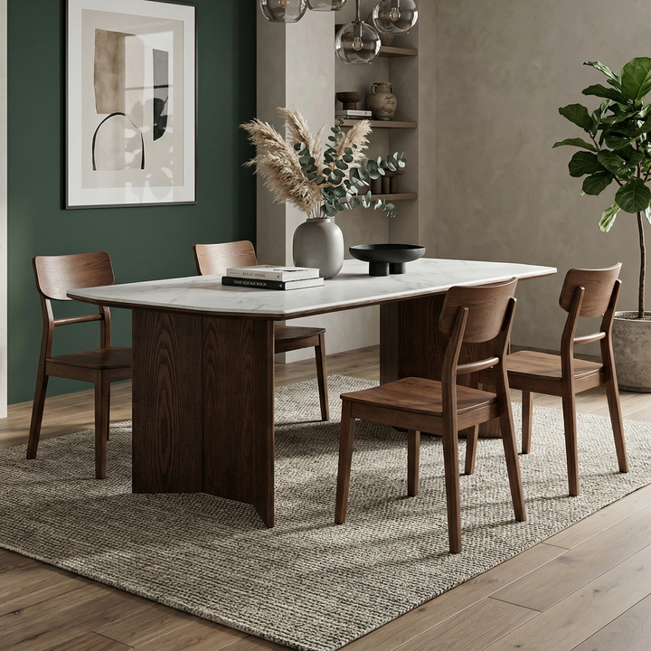The Ravello Dining Table is a sophisticated blend of modern elegance and functionality, featuring a pristine white marble-effect tabletop that adds a luxurious touch. Its warm wooden base showcases a unique panel design, offering both stability and a natural aesthetic. Perfect for hosting dinners or casual gatherings, this dining table elevates any dining space with its timeless style and versatile appeal.