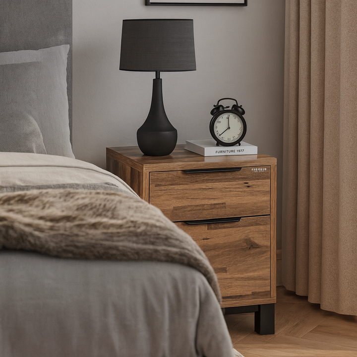 The Corsi Bedside Table brings functionality and style to your bedroom with its sleek elmwood finish and sturdy metal legs. Featuring two spacious drawers with smooth sliders, it provides ample storage for your nighttime essentials while maintaining a modern, minimalist look. Easy to clean and designed to last, it’s the perfect blend of practicality and elegance.